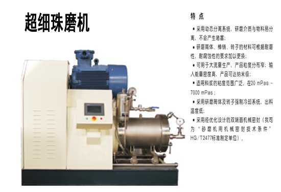 超細珠磨機適用于涂料、油漆、農藥、非礦等物料的超細分散研磨,可以改變筒體裝珠量,以滿足各種不同的物料的需要,有強力的冷卻系統,用微型的研磨介質研磨可達到高品質的要求,研磨白料不會發生發灰現象。