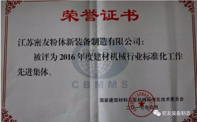 近日,江蘇密友粉體新裝備有限公司喜獲國家建筑材料工業機械標準化技術委員會頒發的 2016年度建材機械行業標準化工作先進集體”榮譽證書,以資鼓勵密友公司在推進產品標準化工作中取得的優異成績。