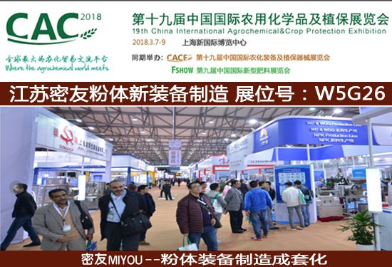 第十九屆中國(guó)國(guó)際農(nóng)用化學(xué)品及植保展覽會(huì)CAC2018---全球農(nóng)化盛宴將于2018年3月7-9日在上海新國(guó)際博覽中心N1-N5及W5館舉辦。江蘇密友粉體新裝備制造有限公司通過一個(gè)面向世界、客商更多、規(guī)模更大的展會(huì),期待與您再度相約!為傳統(tǒng)農(nóng)化行業(yè)轉(zhuǎn)型升級(jí)提供新思維、新機(jī)遇。