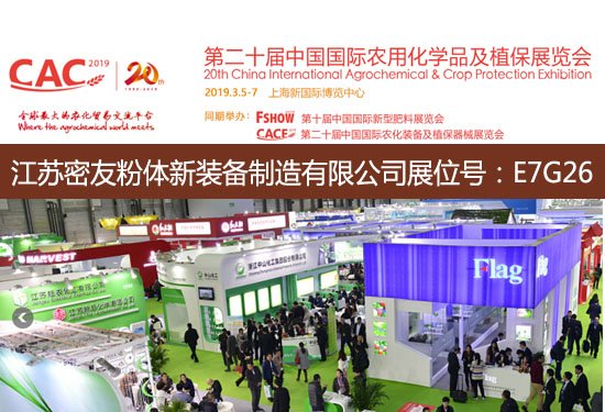 歷經磨礪,CAC國際農化展規模不斷擴大,國際影響力日益提高。2019年展會企業展示占據上海新國際博覽中心N1-N8及E7館。江蘇密友粉體新裝備制造有限公司作為領先的農化行業裝備制造商應邀參加,展位號:E7G26,期待與您再度相約!