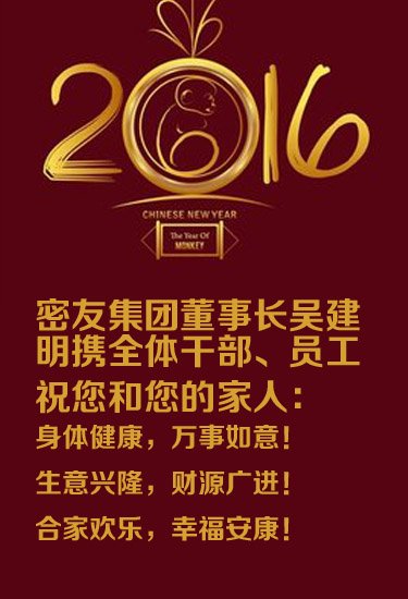 辭舊迎新,回首過去,2015年我們密友在您的信任與支持下使我們保持穩定發展。長期以來,我們攜手并進,彼此間建立了良好的合作關系。我們密友的發展離不開您的支持和幫助,在此向您表示誠摯的感激與謝意。